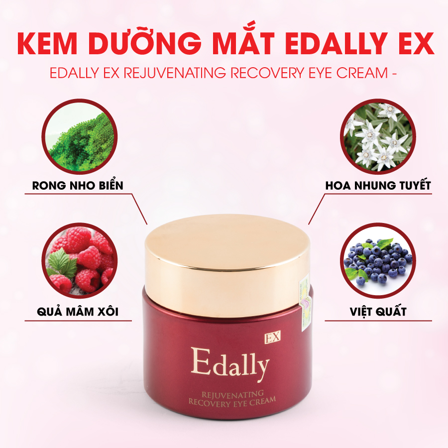 Kem dưỡng mắt Edally EX với chiết xuất rong nho biển, chiết xuất quả mâm xôi, chiết xuất hoa nhung tuyết, chiết xuất việt quất có hiệu quả dưỡng ẩm, chống oxy hóa tuyệt vời, cải thiện nếp nhăn và giúp vùng da mỏng quanh mắt sáng khỏe hơn.